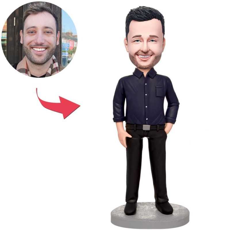 Our Business Man In Black Suit Custom Bobblehead comes with a 365-day warranty, giving you peace of mind in your purchase. Made from high-quality polymer clay, this Custom Bobblehead is built to last and makes a great addition to any collection.
