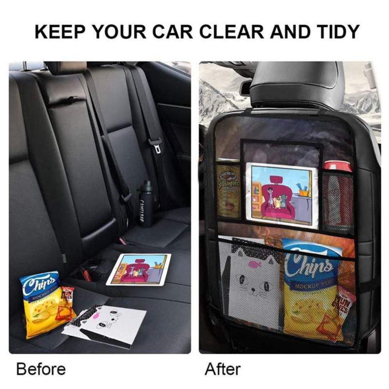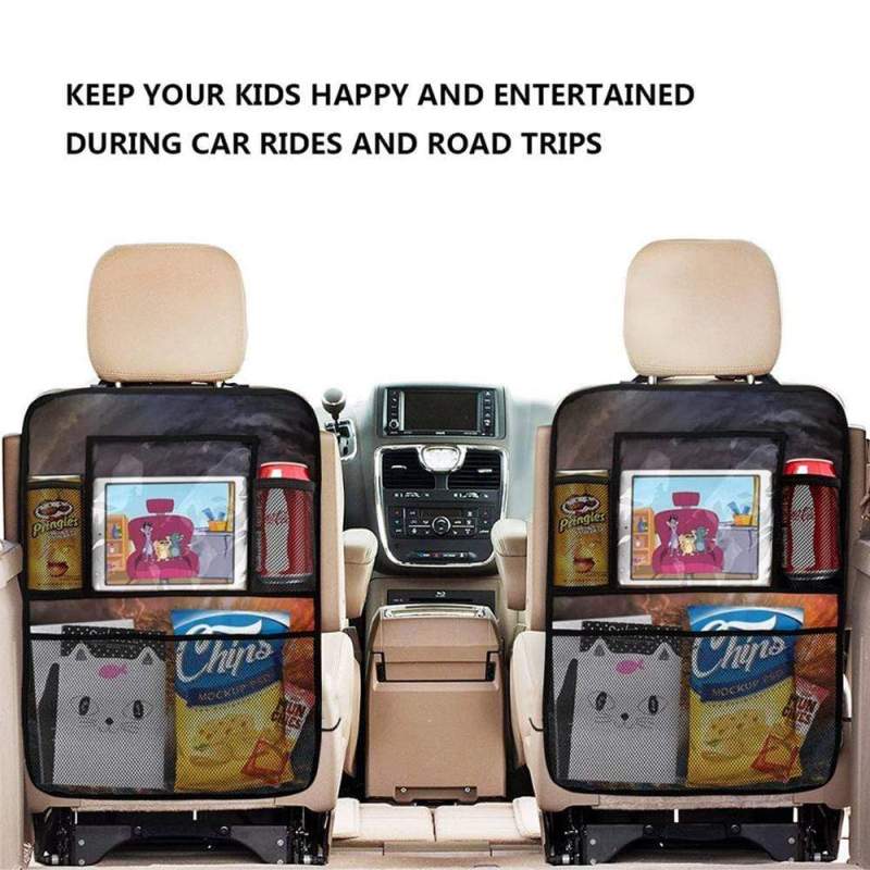 - Large Car Organizer : perfect size for all types of vehicles; Adjustable top and bottom straps that remain hidden and out of the way so the front seat passenger and driver don t feel them. Easy to clean the dirty prints on them, just need a wet cloth to clean it up. Water-resistant, machine-washable fabric for easy care