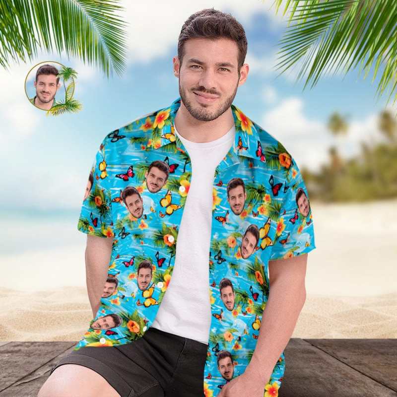 Custom Face All Over Print Men's Hawaiian Shirt Butterflies Yellow Flowers and Leaves