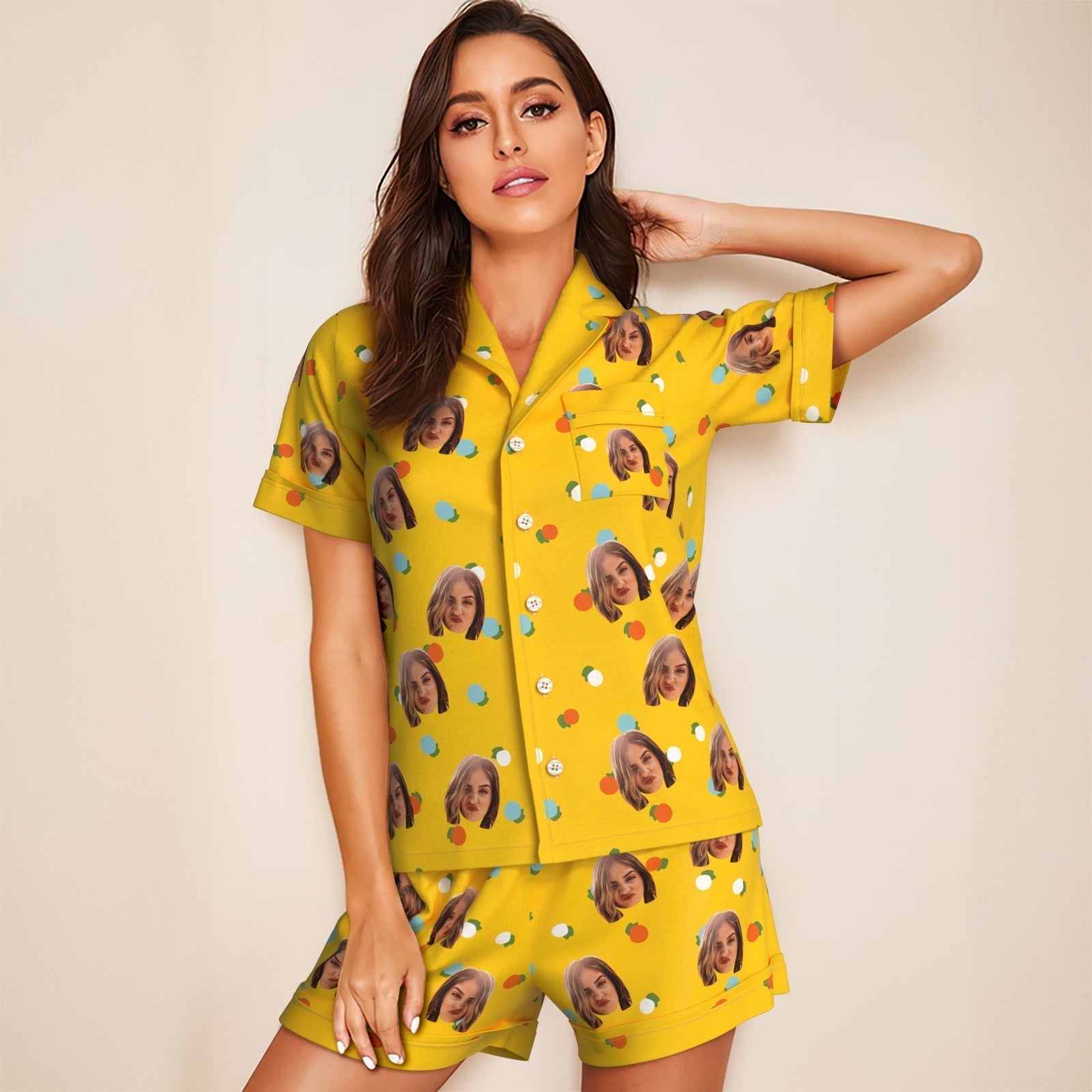 Custom Face Short Sleeved Pajamas Personalized Photo Yellow Sleepwear Holiday Gifts