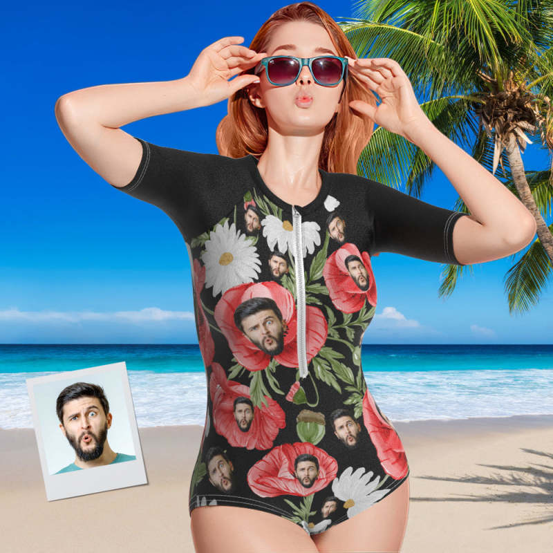 Custom Face Swimsuit One Piece Swimwear Personalized Flower Women's Half Sleeve Swimsuit