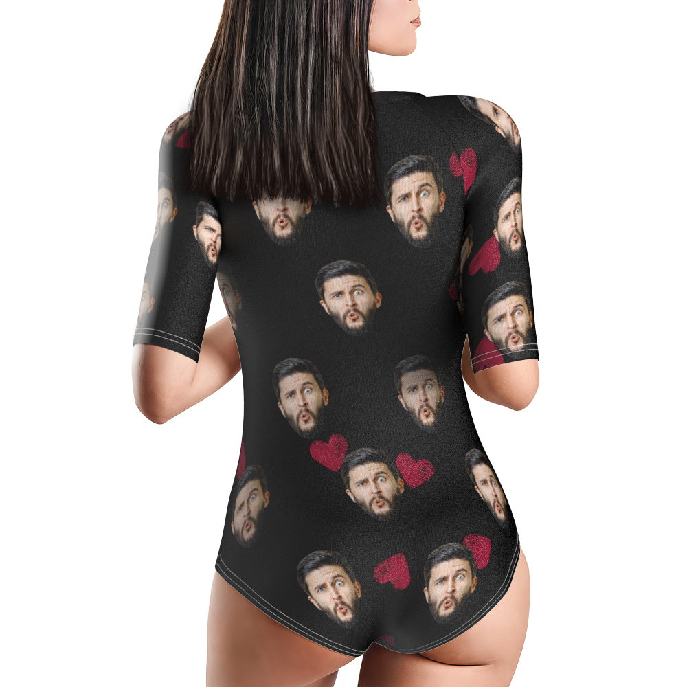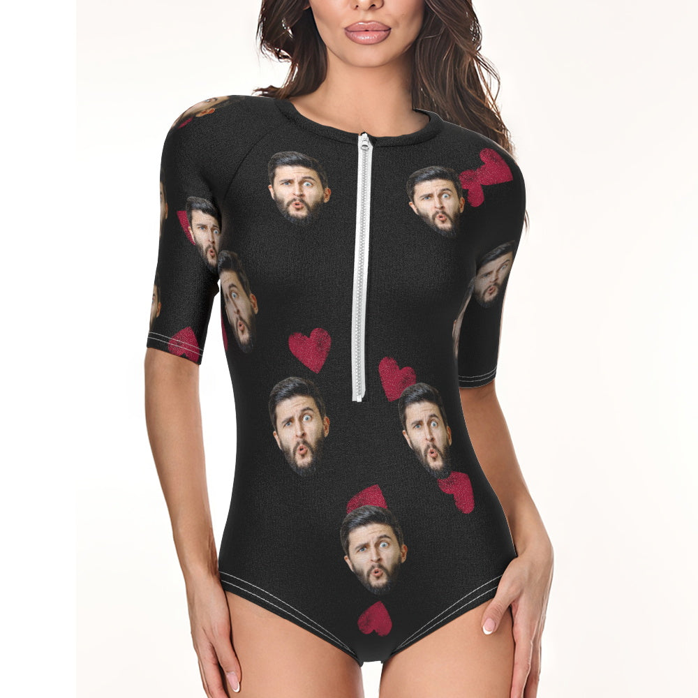 Custom Face Swimsuit One Piece Swimwear Personalized Heart Women's Half Sleeve Swimsuit