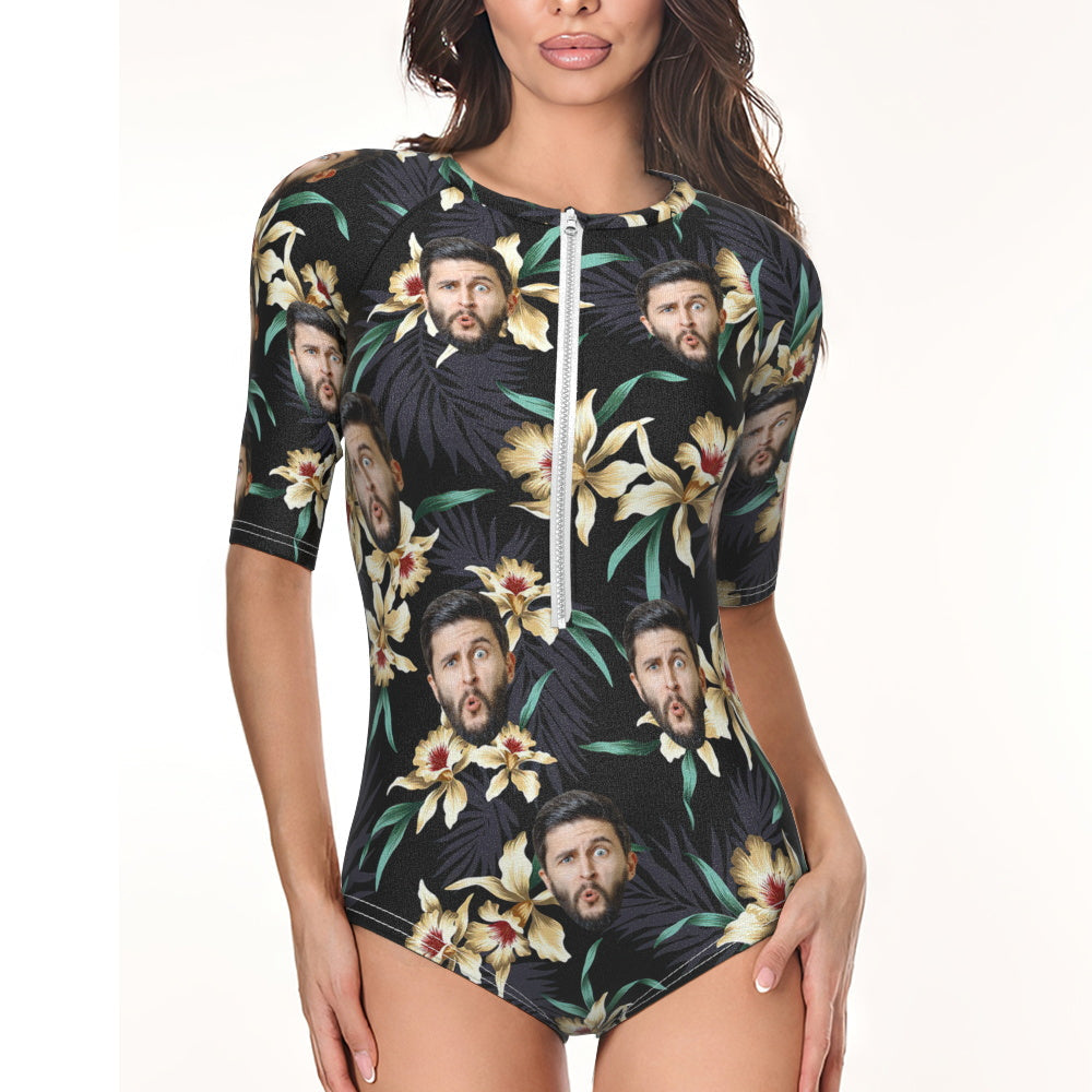 Custom Face Swimsuit One Piece Swimwear Personalized Lily Flower Half Sleeve Swimsuit