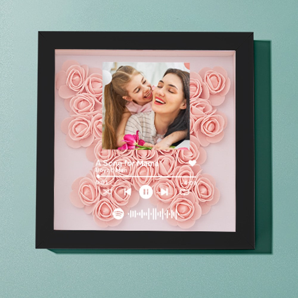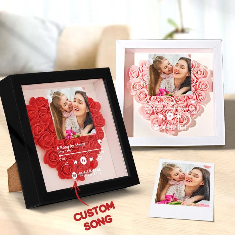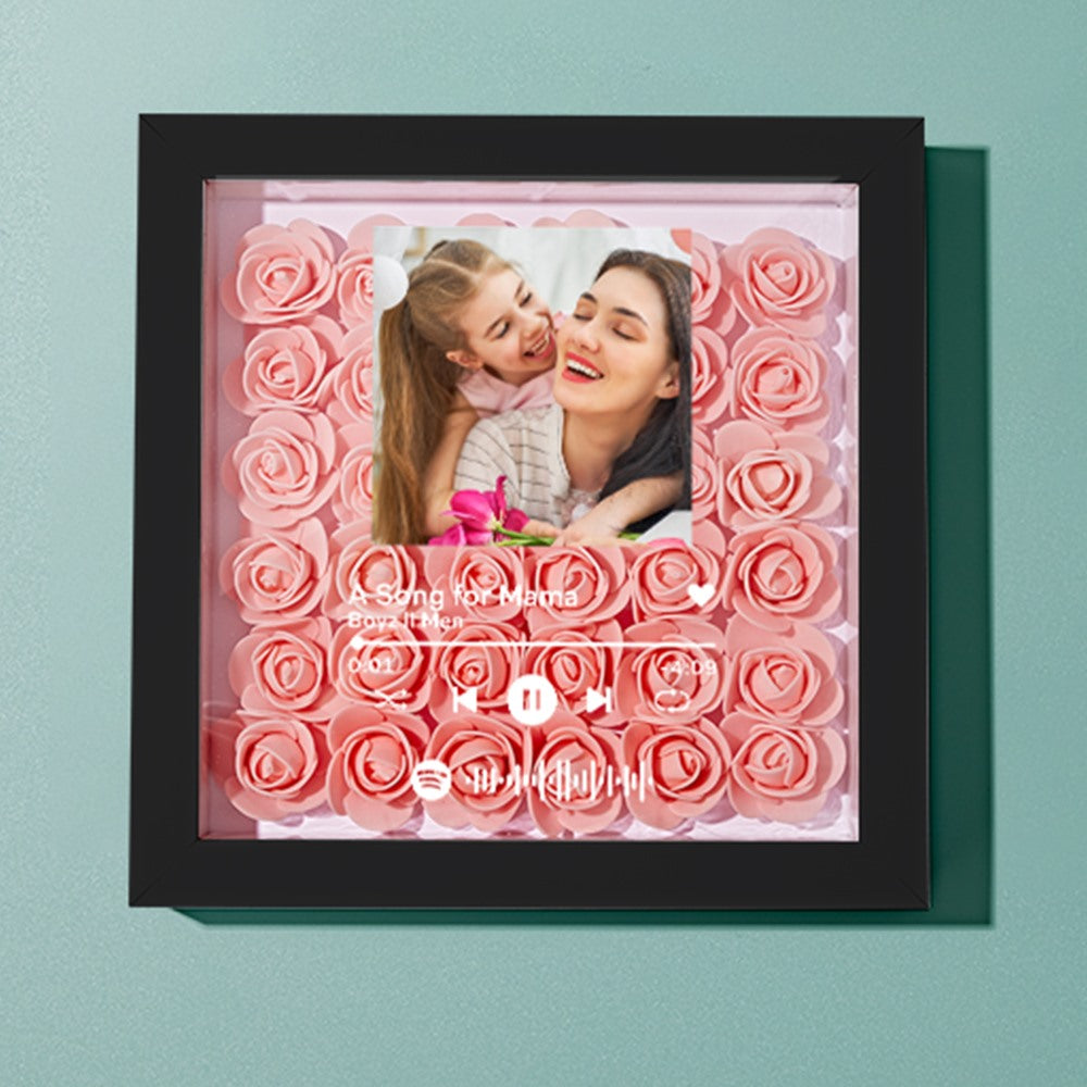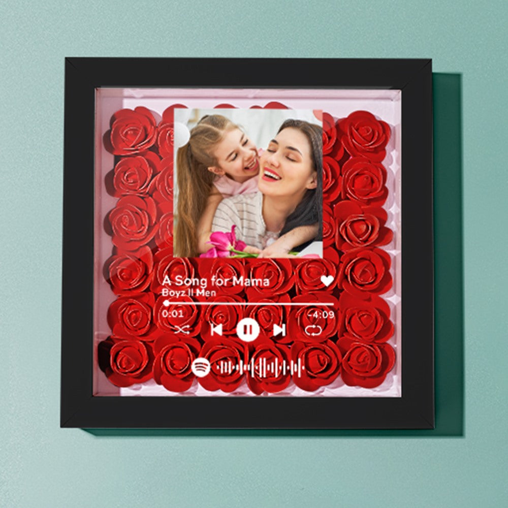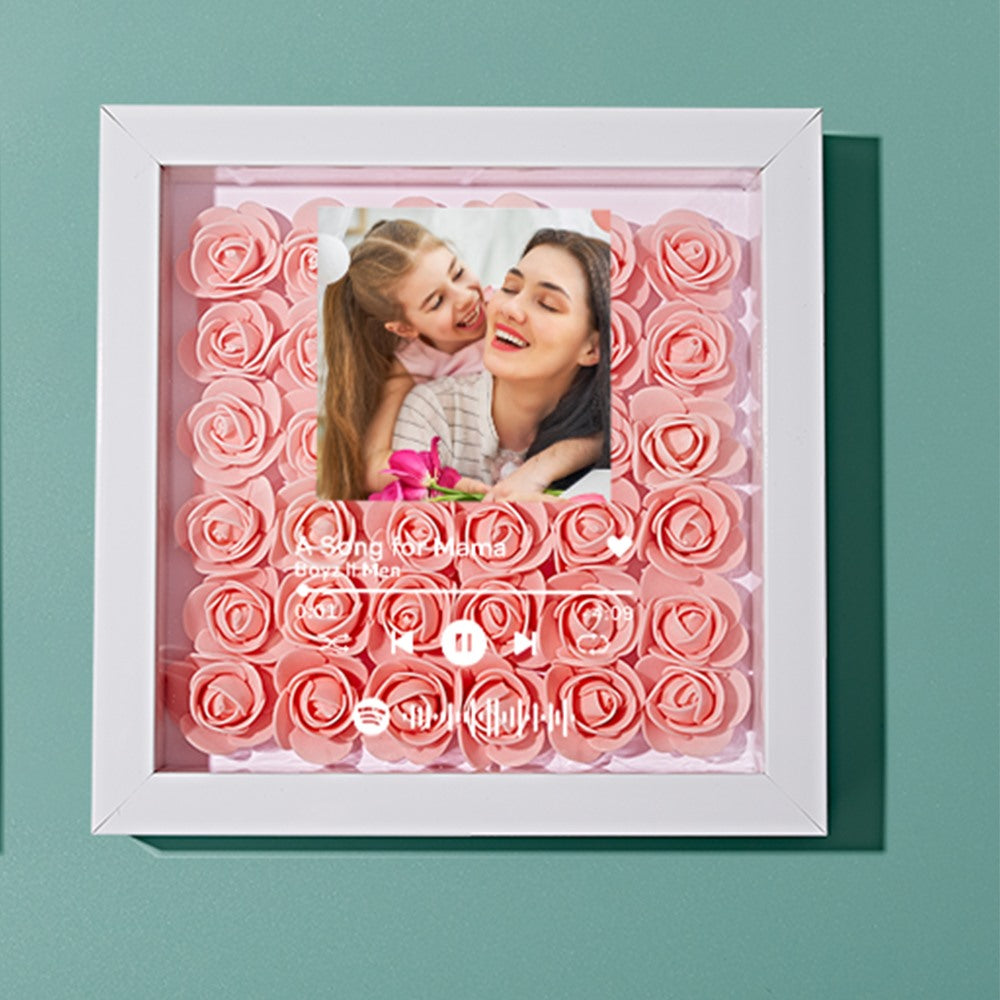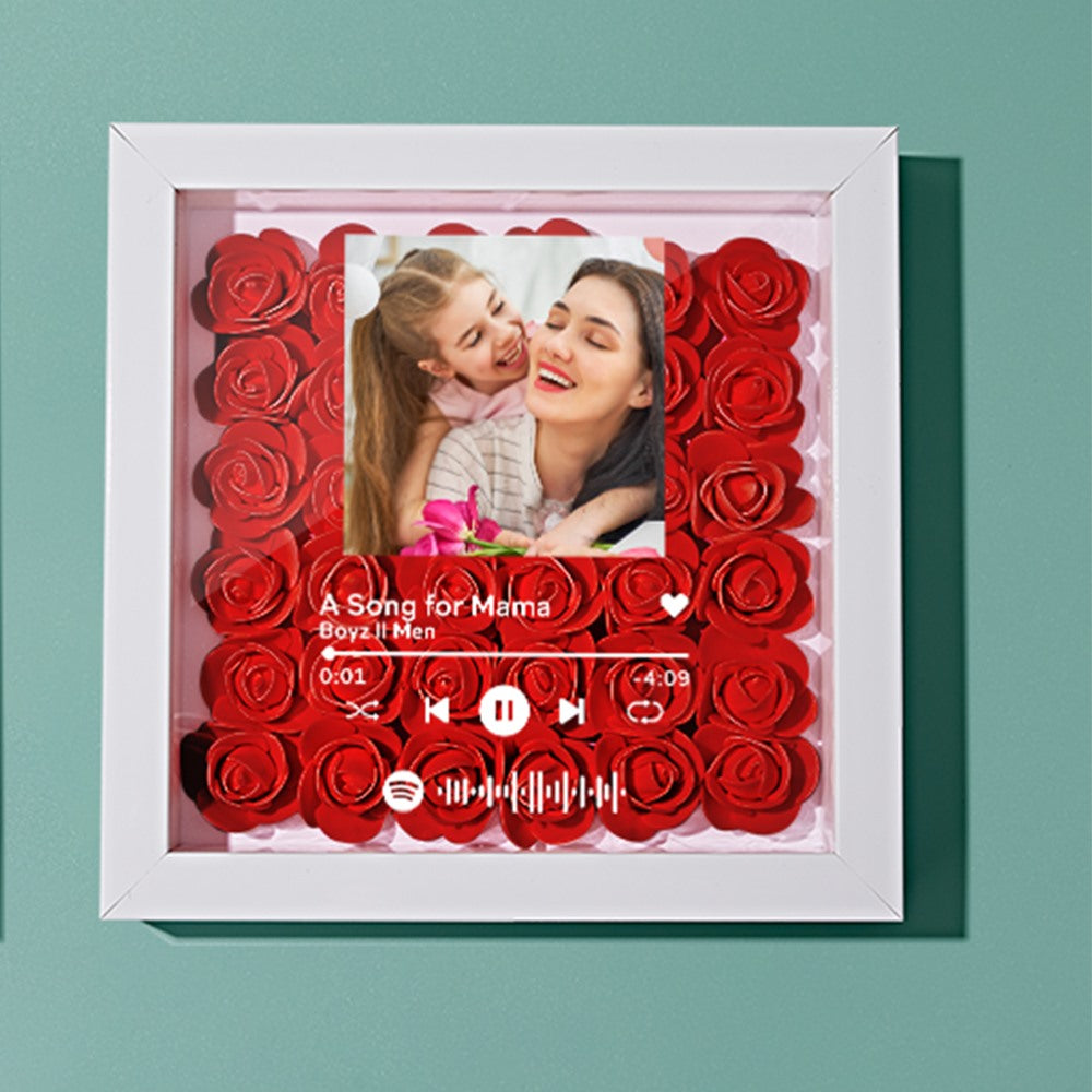 Surprise your loved one with this beautiful, personalized flower shadow box. You can customize it with the picture of you and mom, favorite music and scannable music code to keep your special memories. Show your love with our beautiful roses with varied styles and colors available.