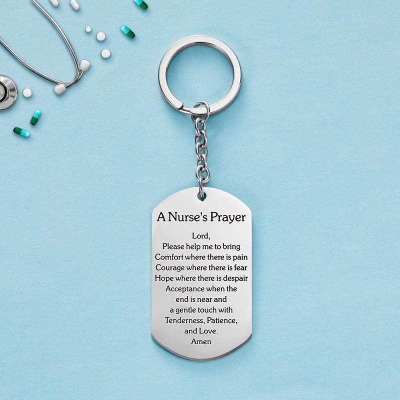 - Silver personalized nurse keychain. It makes a great gift for any nurse, including nursing students or someone who has just become an RN.