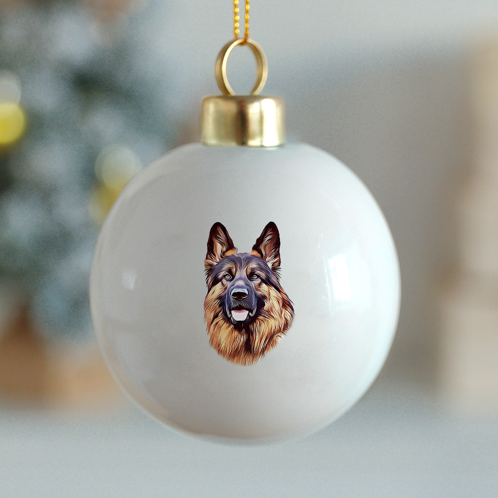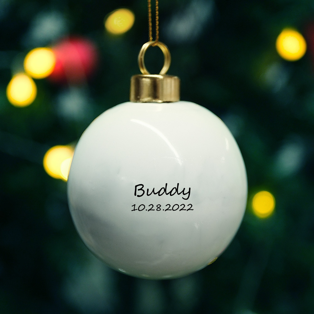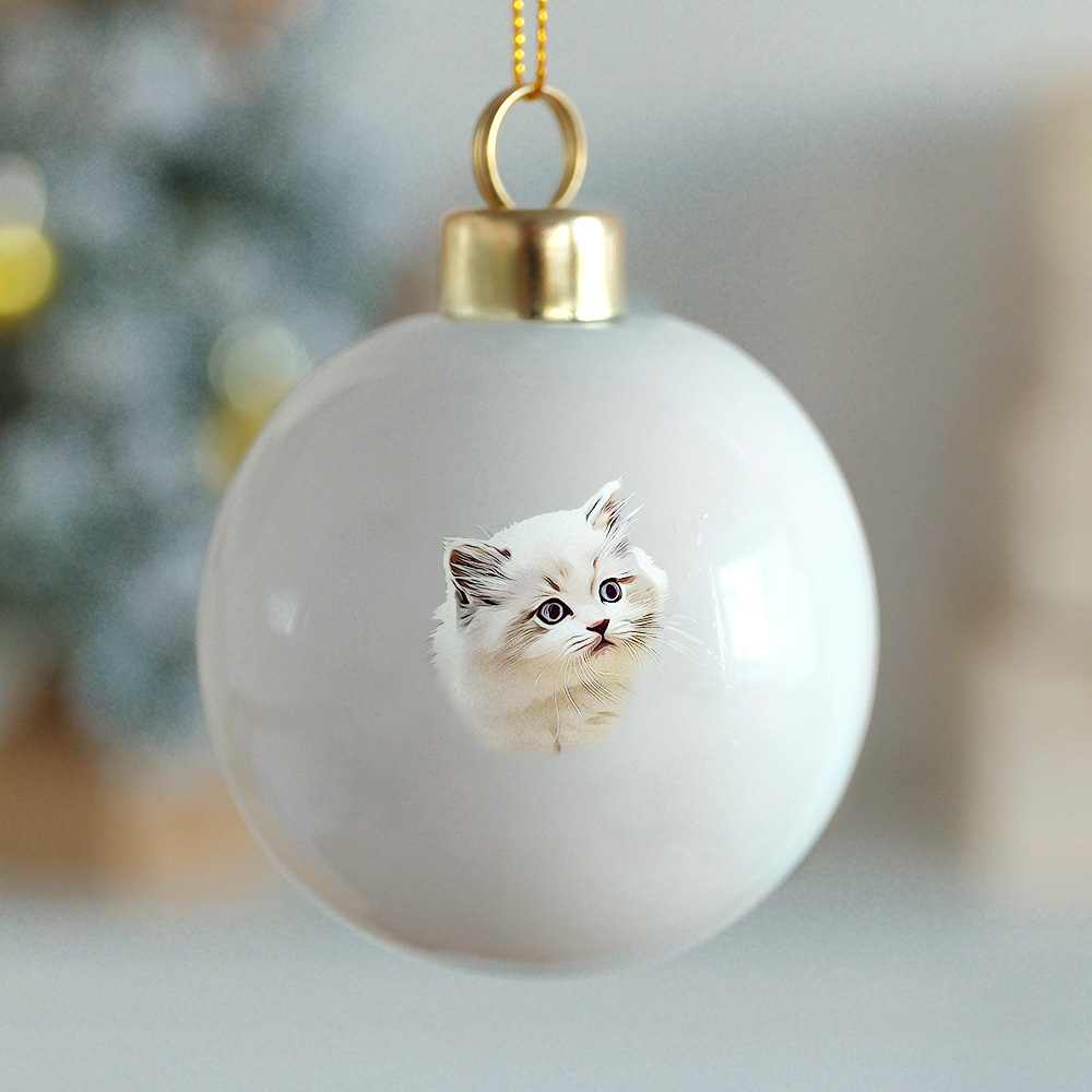Enhance your holiday decor with our exquisite collection of Artfully Printed Hand-Painted Watercolor-Style Pet Portrait Ornaments. These charming ornaments capture the essence of your beloved pets with precision and style. They are round, white, thick durable ceramic, topped with a rustic cap and gold string. Baubles measure around 5.7cm(2.3 inches). You can also add personalized text to the ornament at no extra charge, such as your pet's name and the year.