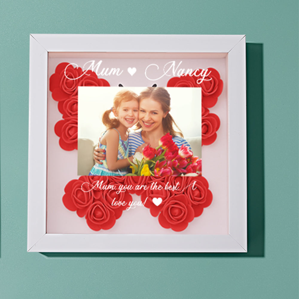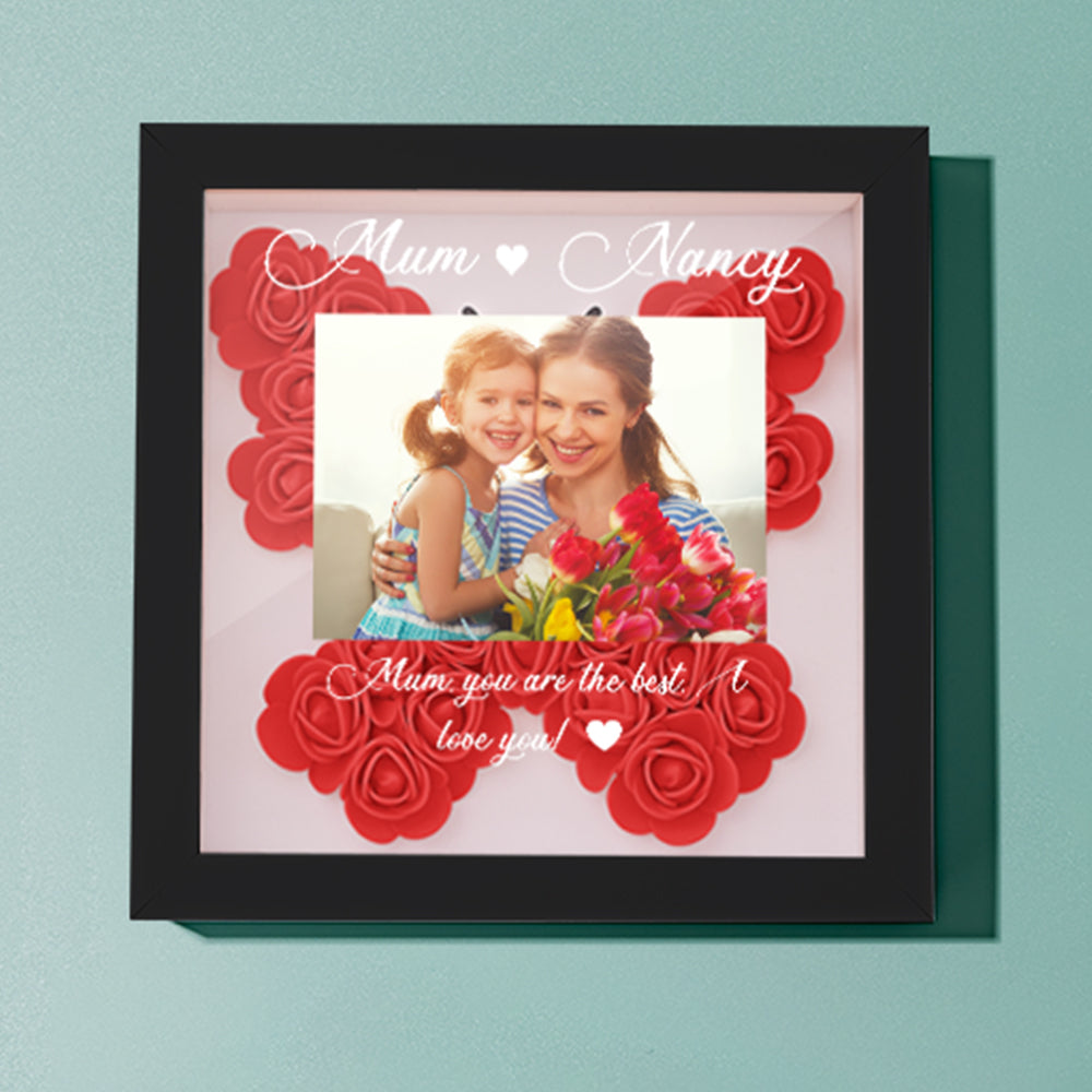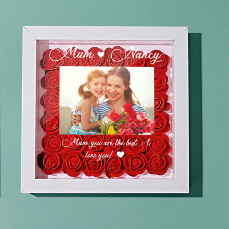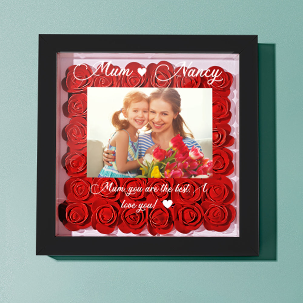 Surprise your loved one with this beautiful, personalized flower shadow box. You can customize it with the picture of you and mom, names and custom text to keep your special memories. Show your love with our beautiful roses with varied styles and colors available.