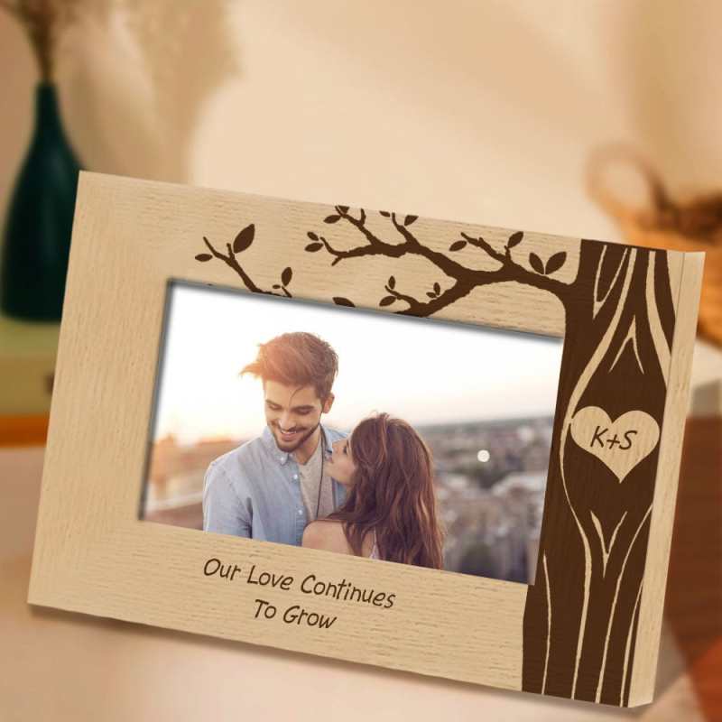 The creative design is delicately UV printed on a handsome, rich wood frame, then personalized with your names, words, and photo for a lasting and memorable keepsake for years to come. You can choose horizontal or vertical orientation.