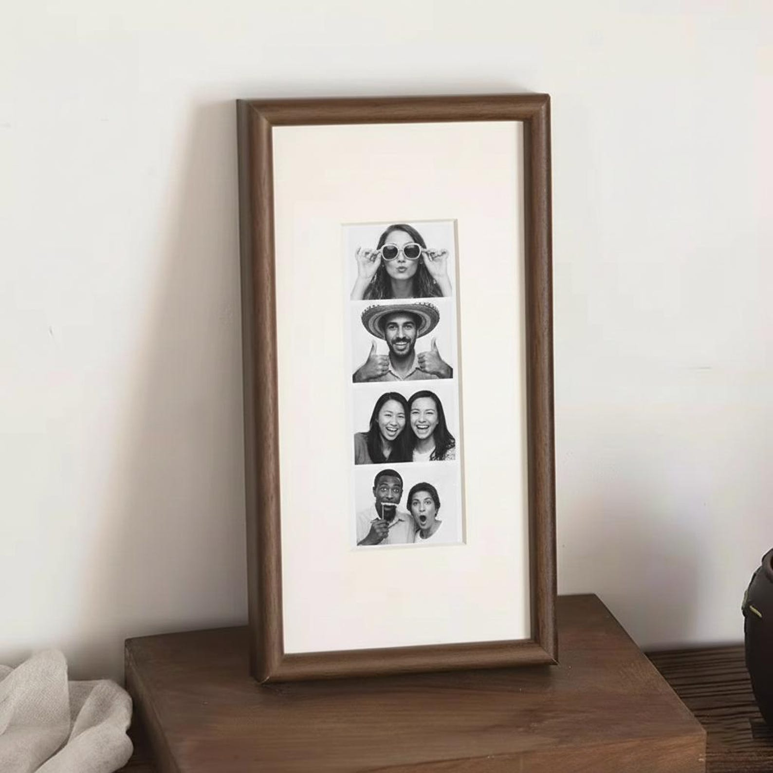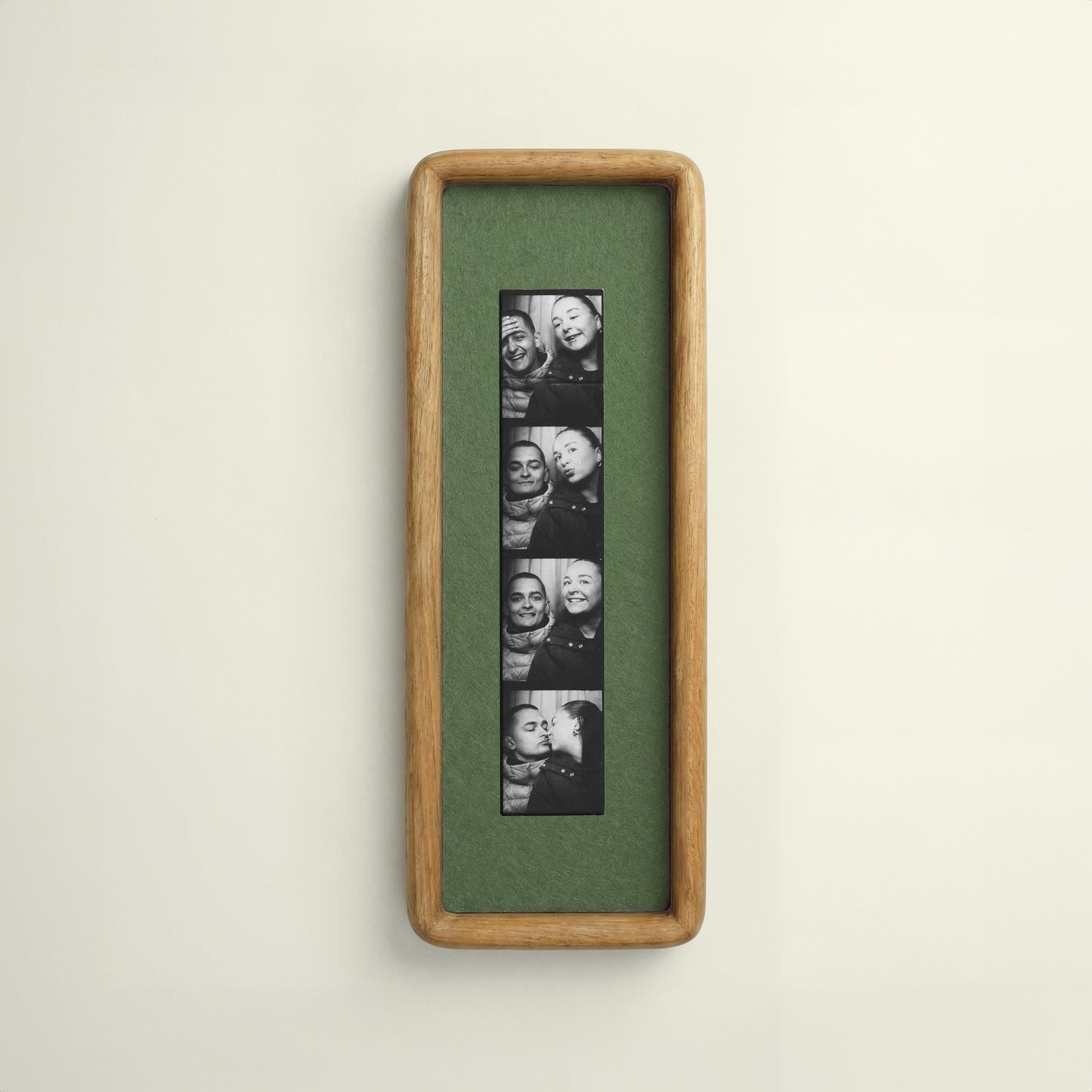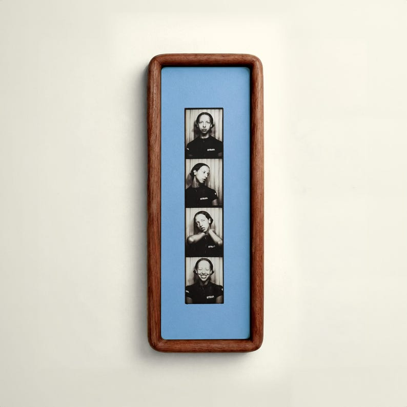 This elegant elongated picture frame is carefully crafted from solid wood and designed specifically to display vintage photobooth photo strips, beautifully centering a classic sequence of four cherished moments 📸