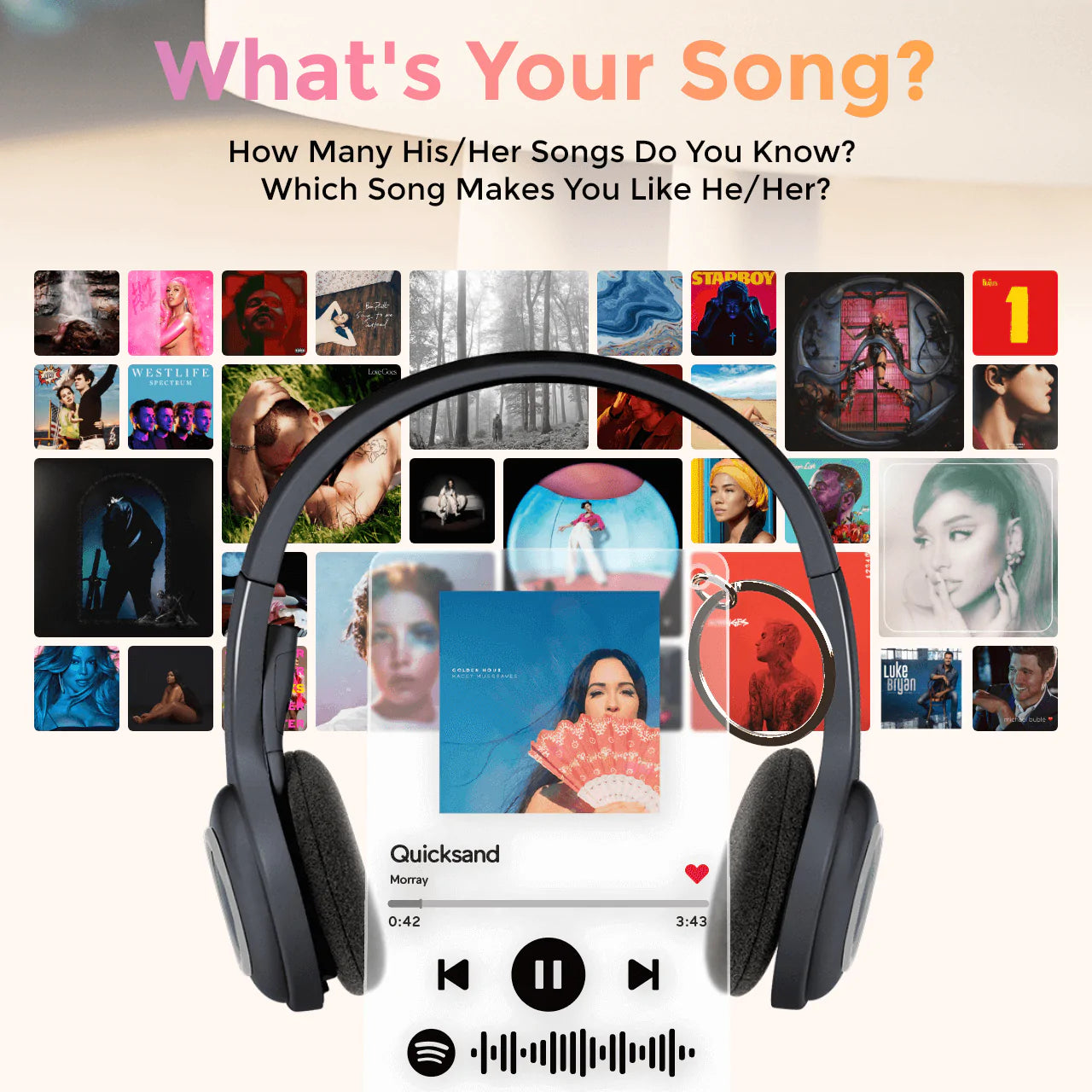 - Choose your favorite song/album and turn it into a beautiful custom song keychain, Plaque frame, keychain+Plaque frame, and night lamp.You can add a Spotify code! As soon as you scan the code on Spotify your song will instantly begin to play.You can automatically search for song titles and artists, and you can also choose to recommend songs.You can customize and upload the photos you designed, you can also choose the song album cover, we provide customers with free choice.Please note that these plaques are made with a clear acrylic sheet that ensures safety during transit and is much more durable than glass, they arenot made from acrylic.