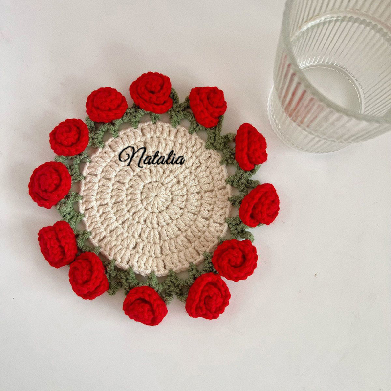 This custom name coaster creative gift bouquet cleverly combines the design of crocheted coasters and handmade rose bouquets. The coasters support exclusive name customization, and the fine crocheting process shows a delicate texture; the handmade rose bouquet uses weaving techniques to create a three-dimensional flower shape, which is portable and eye-catching. It is suitable for home decoration, holiday gifts, desktop embellishment and other scenes, conveying unique thoughts to people who pursue personalized handmade warmth, and injecting a romantic sense of ritual into life