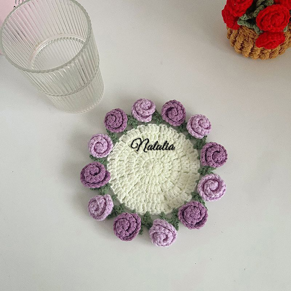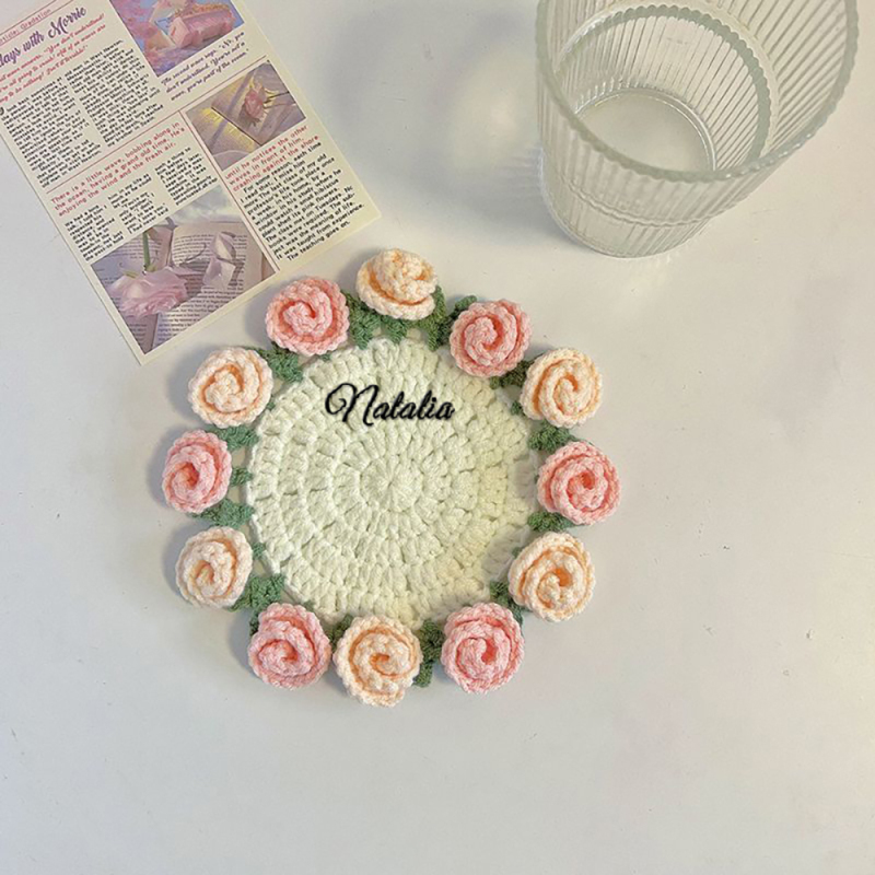 Customized Name Coaster Creative Gift Bouquet Crocheted Cup Finished Rose Bouquet Handmade Hand-Held Flower Woven Coaster