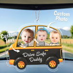 Crafted with whimsy and affection, this car hanging features a charming cartoon depiction of a baby driving a colorful car. The inclusion of the baby's portrait adds a personal touch, capturing a moment of joy and innocence while symbolizing the precious role of fatherhood. Additionally, the inscription 'Drive safe, daddy' serves as a loving reminder for the recipient to prioritize safety while on the road, emphasizing the importance of family well-being.