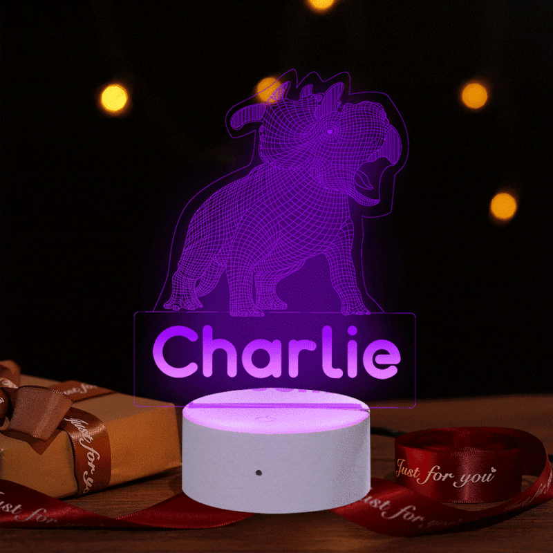 Each light is personalized and laser-etched on our specialized high grade optical acrylic to including your name along with one of our many unique designs such as an adorable T-Rex Dinosaur, Tyrannosaurus, Triceratops, and Diplodocus
