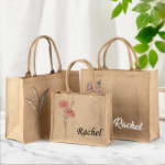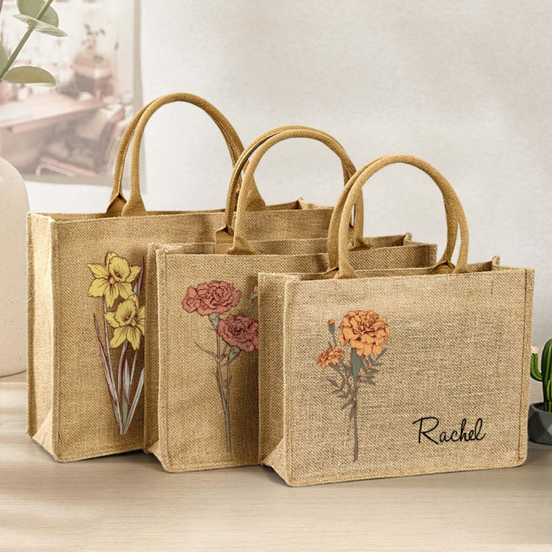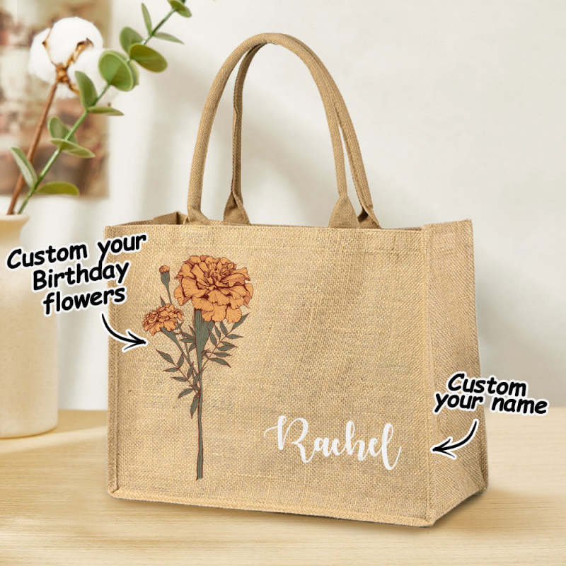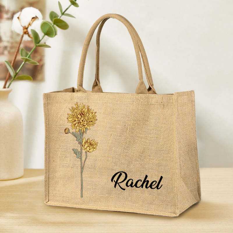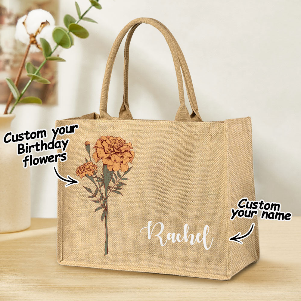 Personalized Birth Flower Beach Jute Tote Bag with Name Birthday Wedding Party Gifts for Women