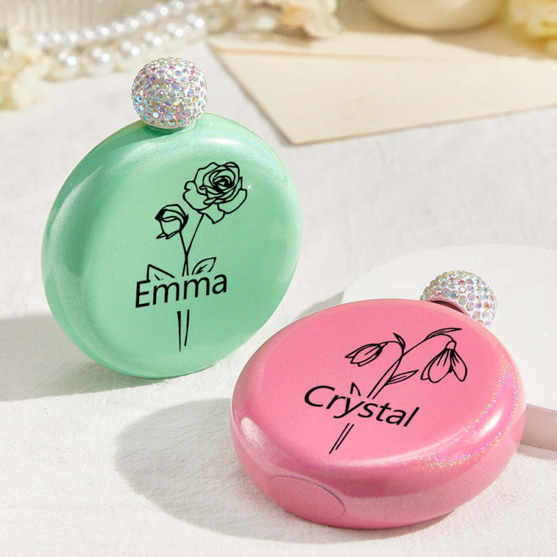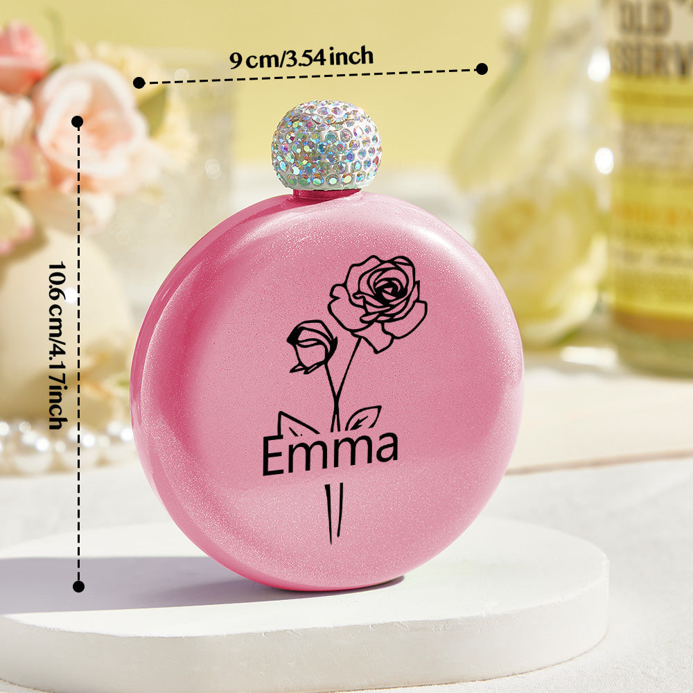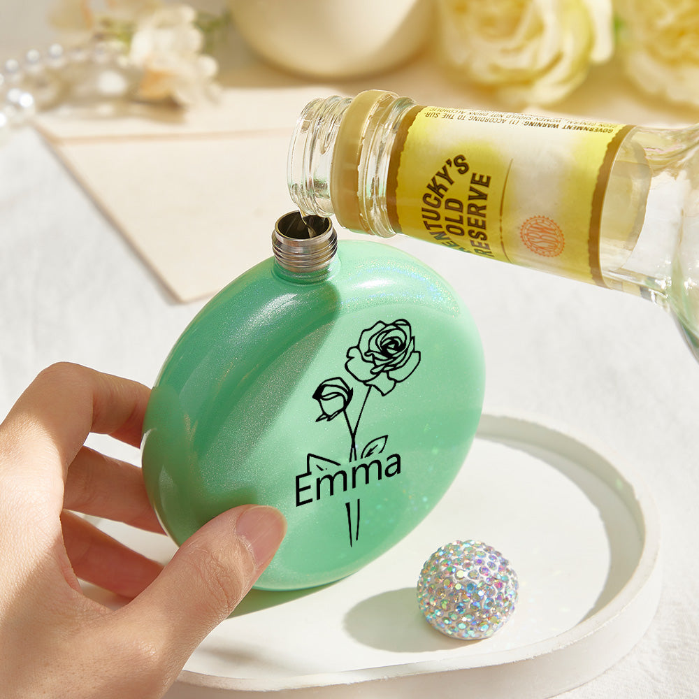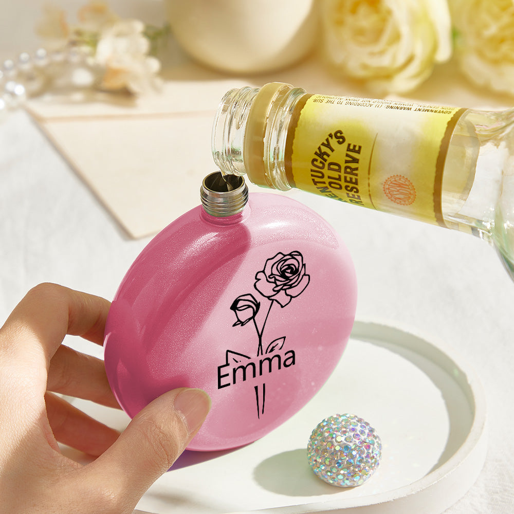 Personalized Birth Flower Round Flasks with Name 5oz Glitter Flask Wedding Birthday Gift for Her