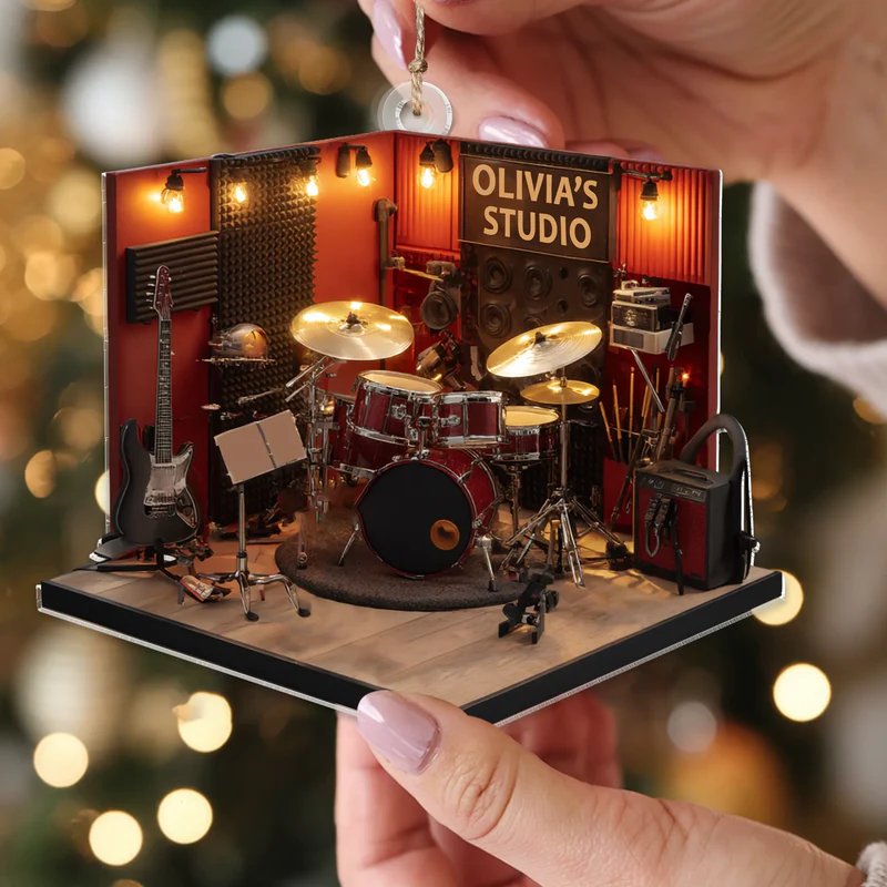 Turn your love of music into a holiday centerpiece with our Personalized Drum Studio 2D Flat Acrylic Ornament. At first glance, it looks like a miniature 3D drum studio complete with a full drum set, guitars, amplifiers, music stands, and glowing lights. But here’s the secret – it’s actually a 2D flat ornament, specially designed with high-quality printing to create the illusion of depth and dimension.