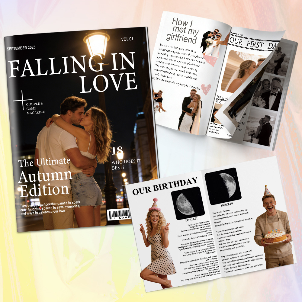 Pour your love into Personalized Couple Magazine - a unique keepsake designed to celebrate your love story in the most creative way. Each page is crafted with your photos, names, meaningful dates, and sweet moments, transforming them into a stylish magazine-style layout that feels both fun and heart-warming.