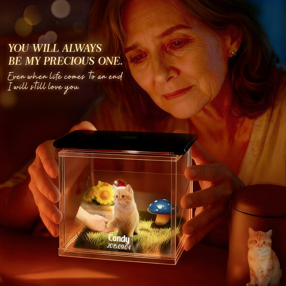 Each piece is customizable - simply upload your pet’s photo to create a personalized 3D holographic effect that brings their presence to life. Whether displayed on a desk, shelf, or memorial corner, it serves as a touching reminder of your special bond.