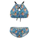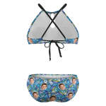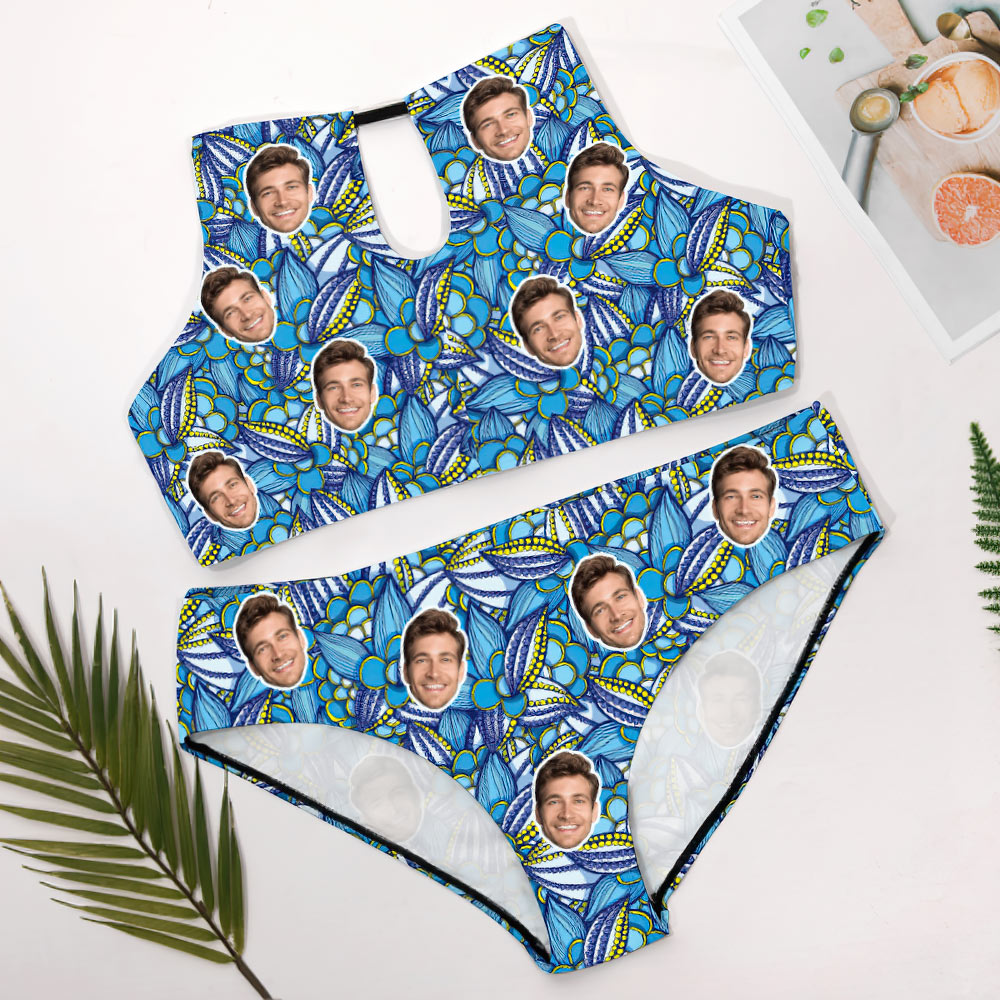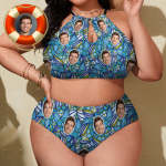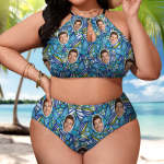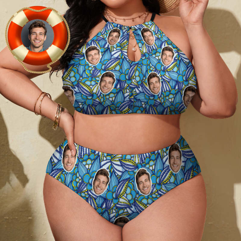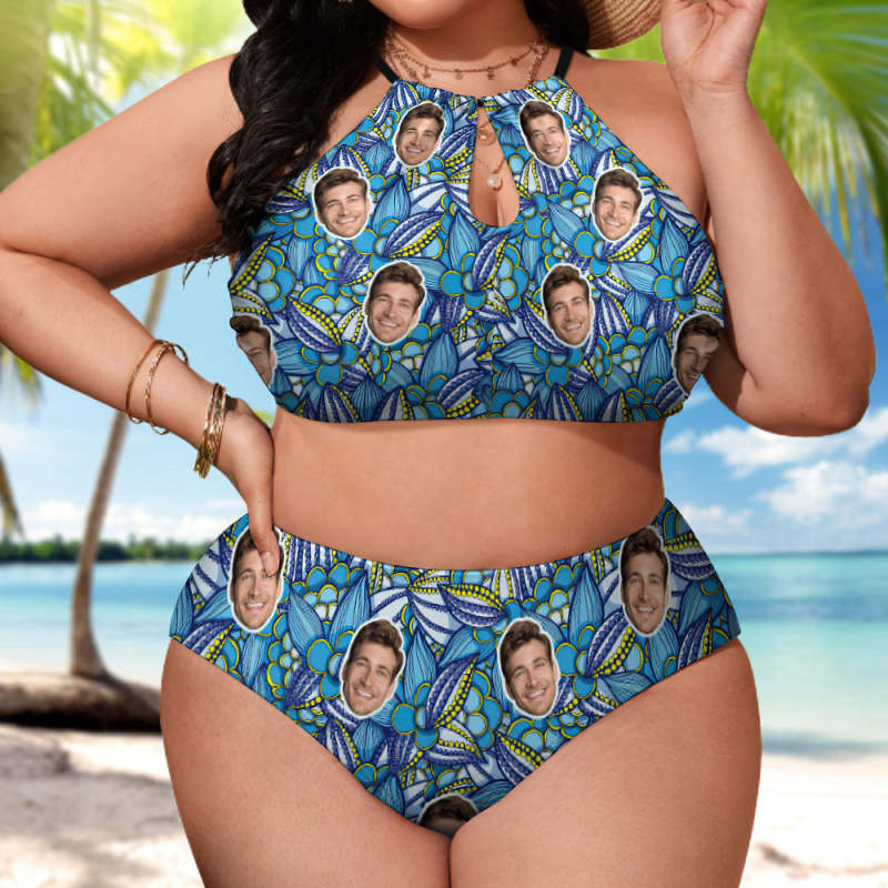 Plus Size Swimwear With Face High Waisted Swimsuit Gifts for Women - Blue Floral